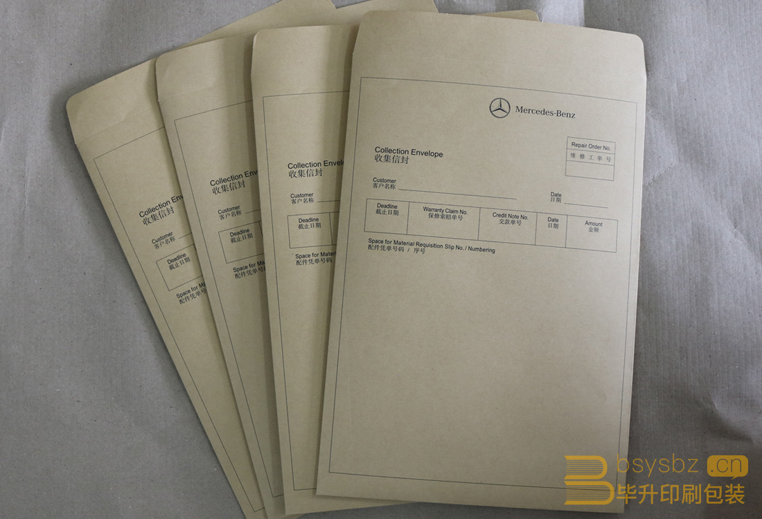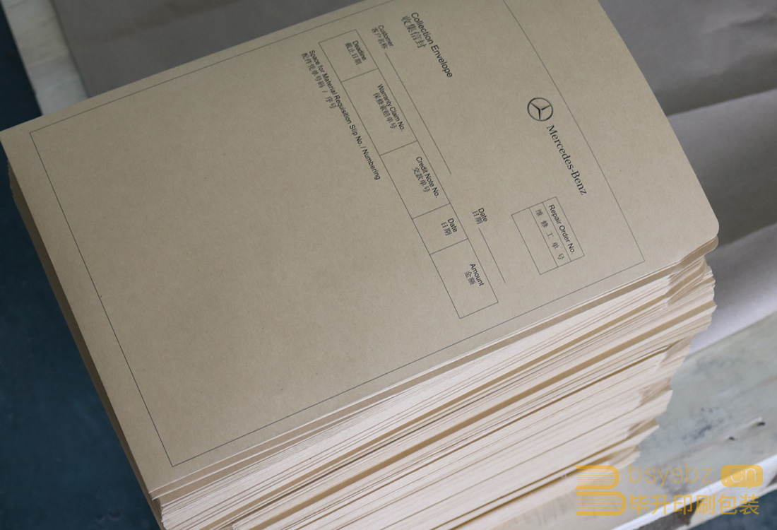 奔馳維修工單袋、信封選用進口黃牛皮紙專色黑印刷、刀模、膜切、糊袋。