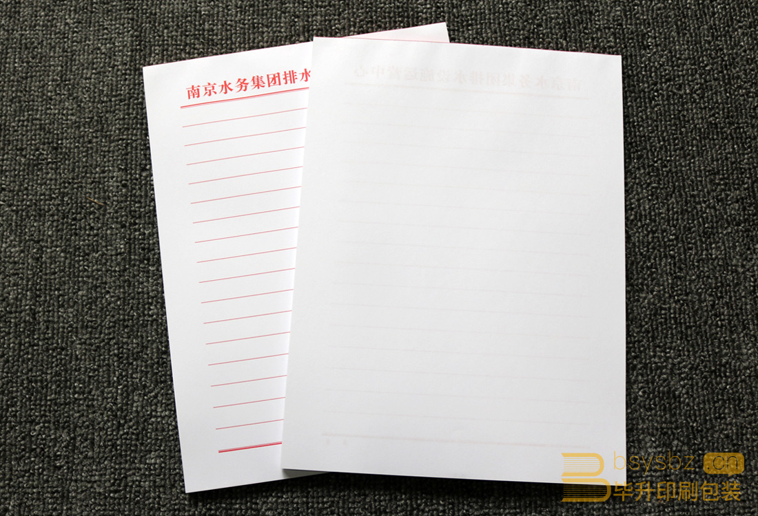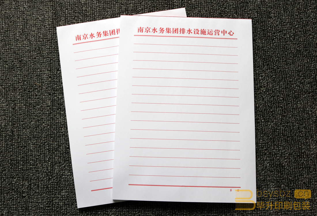 南京水務(wù)集團排水設(shè)施運營中心委托南京畢升印刷公司為其印刷的信紙、紅頭文件,此信紙規(guī)格為210*297mm、80g雙膠紙、單色紅印刷、100張/本,紅色膠頭。信紙推薦選用80g、100g的雙膠紙,極少一部分使用120g雙膠紙,不能使用銅版紙因為銅版紙上面不方便寫字。