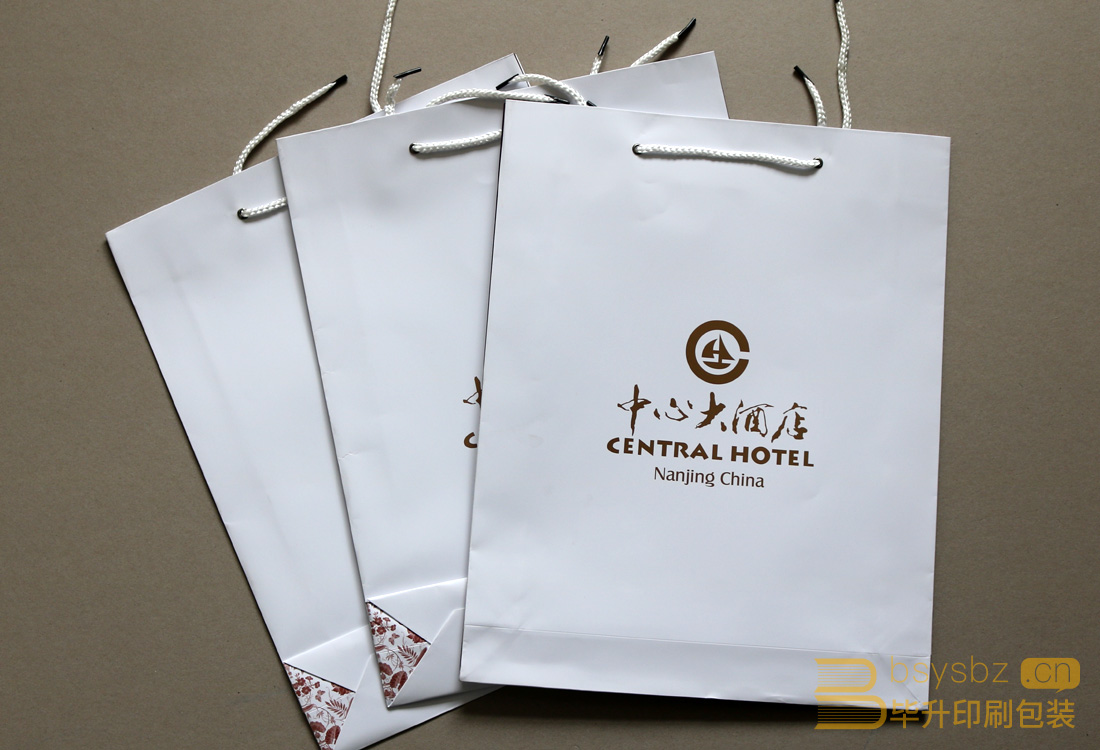 南京中心大酒店委托南京印刷廠印刷的手提袋為了彰顯5星酒店的高端和與眾不同選用230g進(jìn)口銅版紙四色加專色金印刷,裱啞膜、打氣眼。