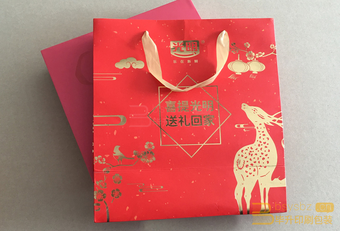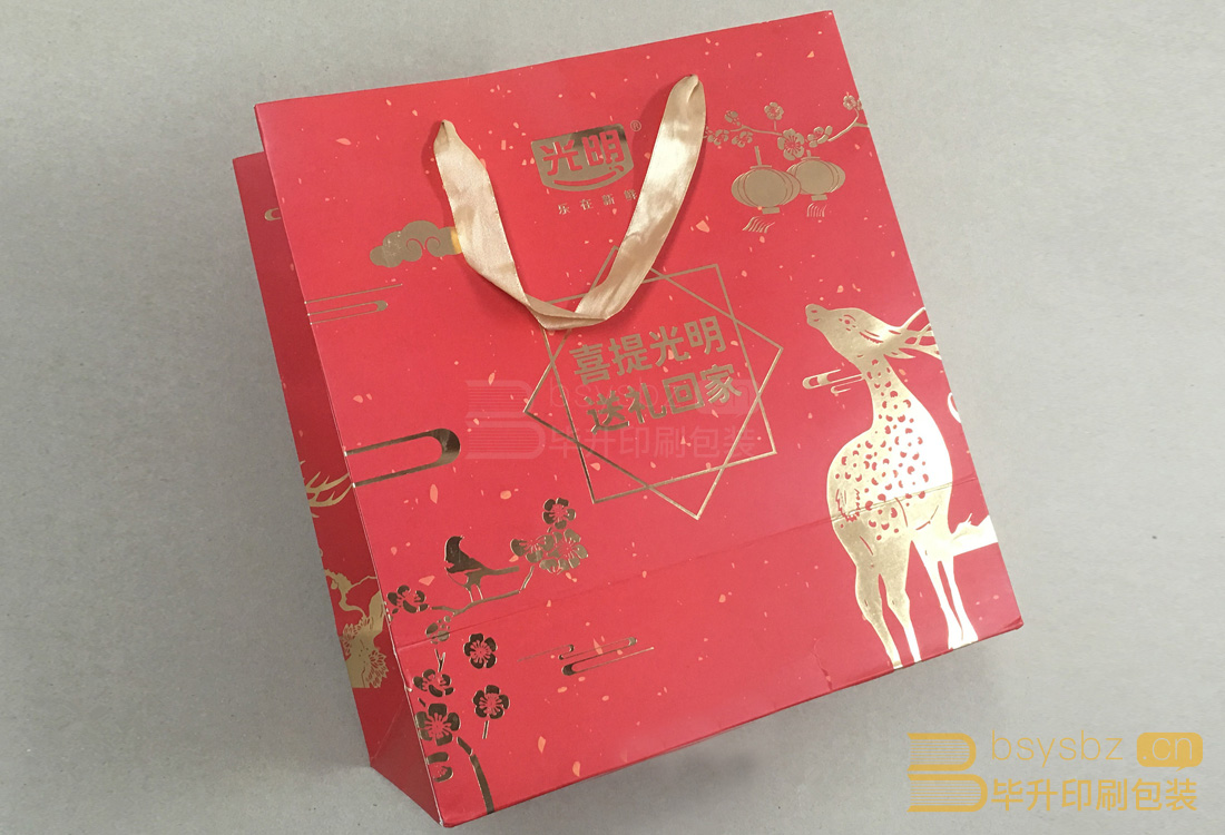 此款手提袋彩色四色印刷裱啞膜、燙黃金,加金色絲帶,滿底色的紅、大面積的燙金還是比較有質(zhì)感的。喜提光明、送禮回家、首選畢升。