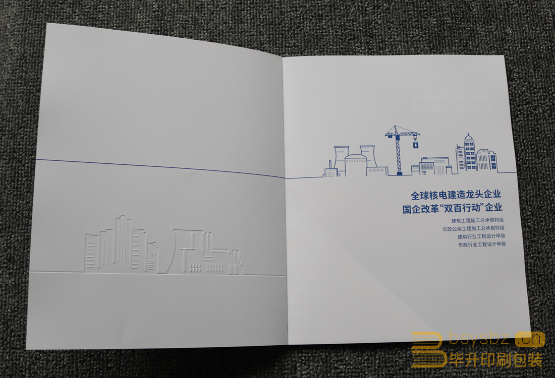 中國核工業(yè)華興建設(shè)企業(yè)宣傳冊全書使用綠色環(huán)保紙印刷;封面280g超感紙、四色印刷、燙銀、壓凹凸,內(nèi)芯選用130g啞印超感紙過啞油(樹脂光),鎖線膠裝。